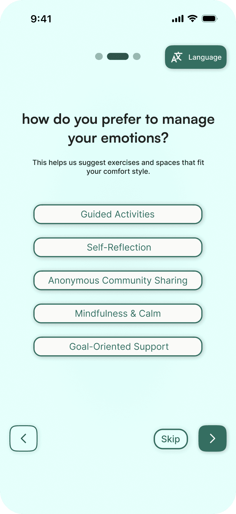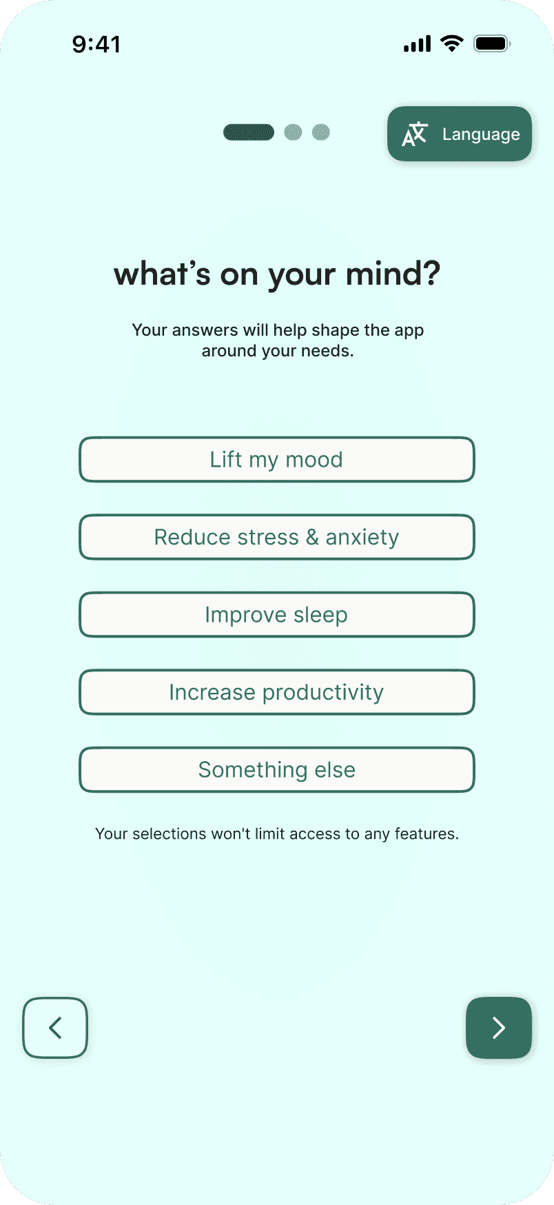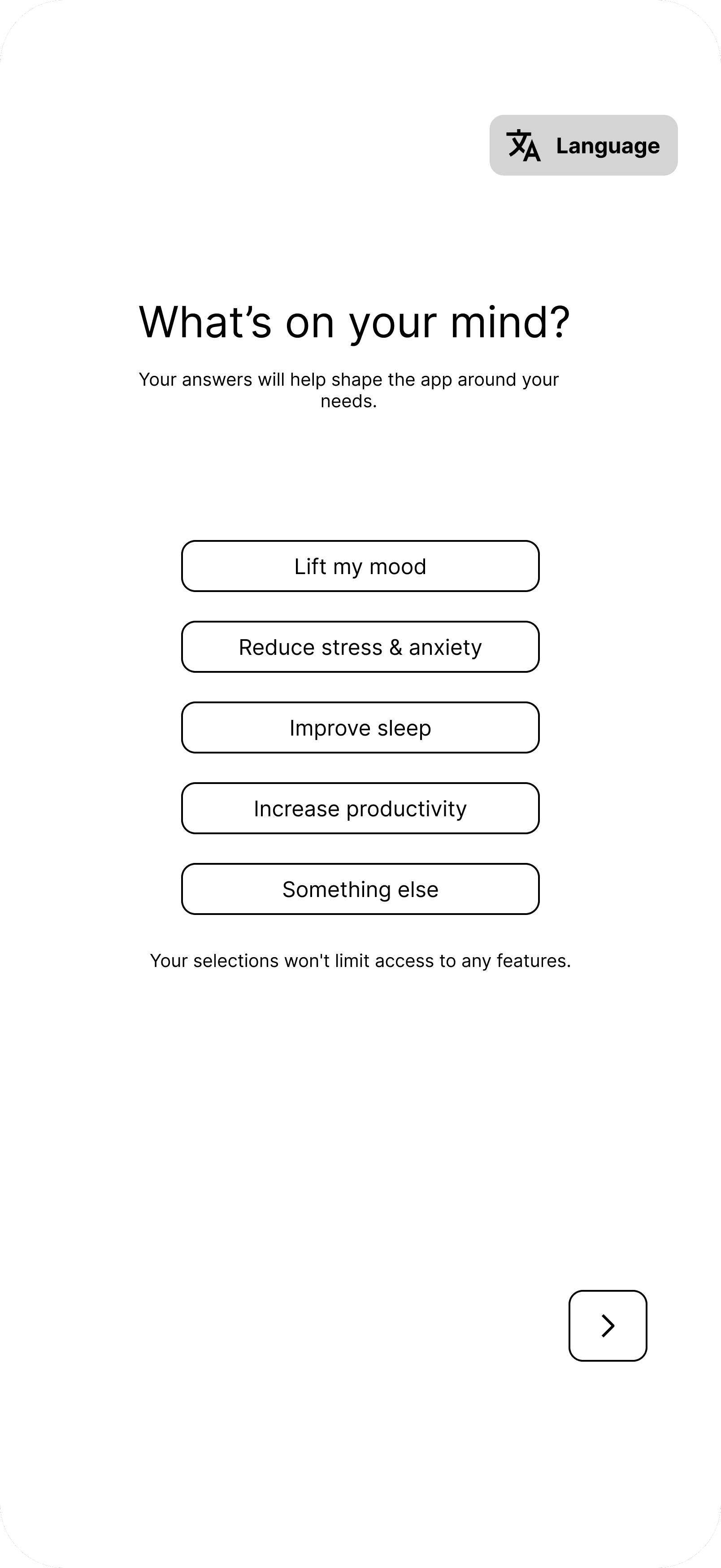 A sub 10 second mood check reduces early friction and encourages first session completion.