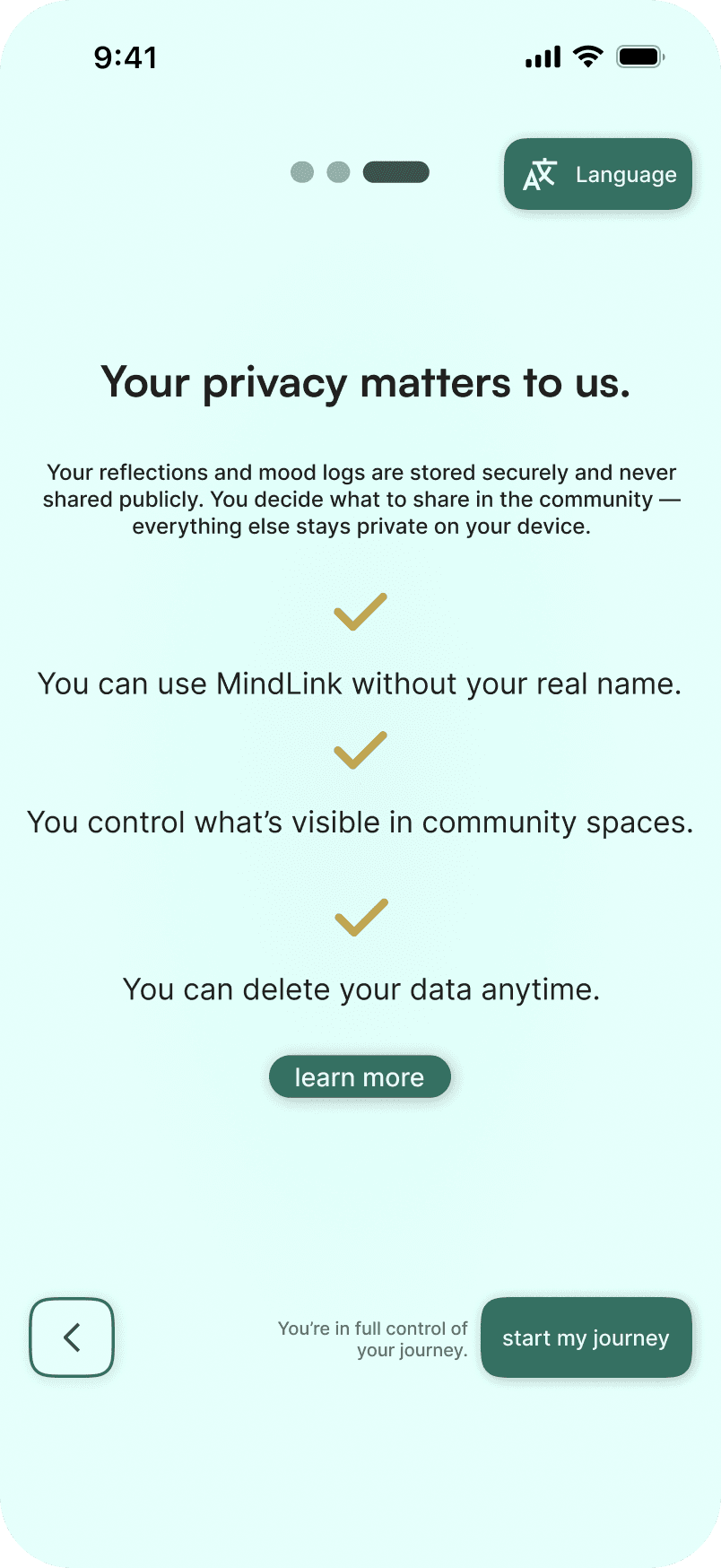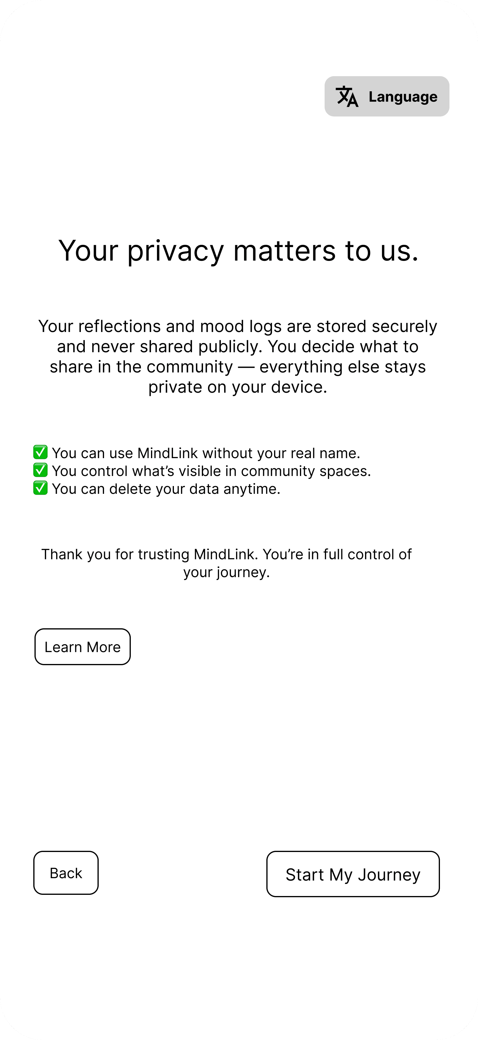 Privacy first onboarding order: Anonymity selection moved to the first step to establish trust and reduce early drop off.